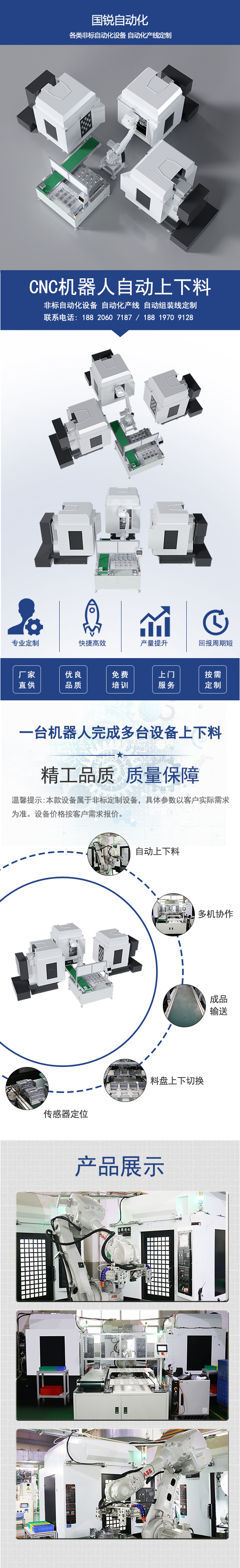 设备由人工上下料位、六轴机器人、成品下料拉带及专用上下料治具组成,结构稳定、适配性强,可满足各类 CNC 加工需求。工作时,人工完成上料准备,六轴机器人自动取料,依次执行:自动取料、开机床门、取出成品、吹气清洁、装夹新料、关闭机床门、放置成品等动作,配合 CNC 自动加工,最后通过下料拉带完成成品输送。该方案以一台机器人负责三台 CNC,大幅提升加工效率、降低人工成本,实现机床上下料自动化、标准化、连续化作业,设备支持深度定制,可满足不同客户多样化的需求。